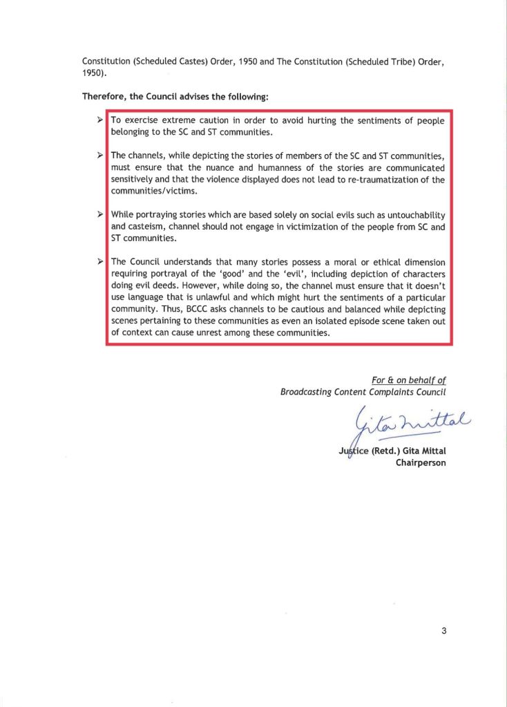1. Broadcasting Content Complaint Council’s (BCCC) Advisory on Portrayal of SC and ST Communities on Television, Indian Broadcasting & Digital Foundation: https://www.ibdf.com/advisories
