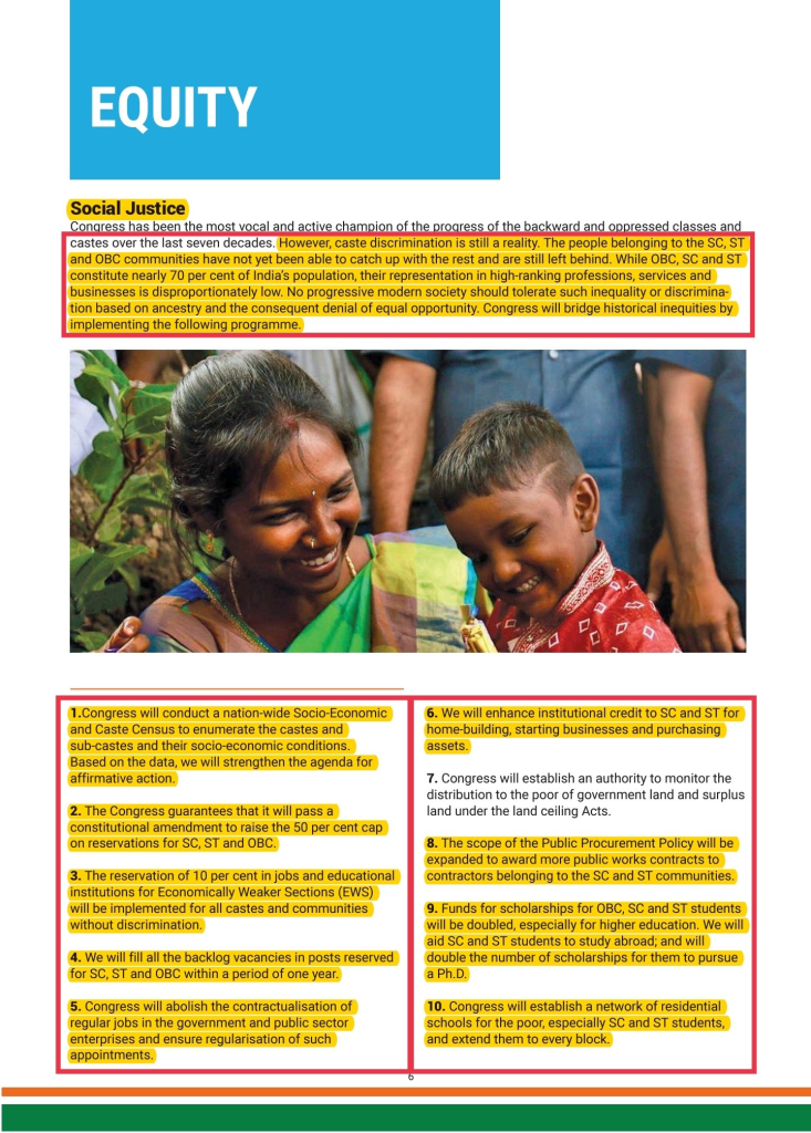 The Indian National Congress’ election manifesto, Nyay Patra, acknowledges the reality of caste and caste-based discrimination. It recognizes the disproportionately low representation of Scheduled Castes and emphasizes the need to address historical inequities. However, it does not propose a legislative pathway for the annihilation of caste. The manifesto omits critical issues related to the Scheduled Castes and the Scheduled Tribes (Prevention of Atrocities) Act, 1989. It employs vague and open-ended language, lacking specificity, and fails to provide justifications for contentious issues.