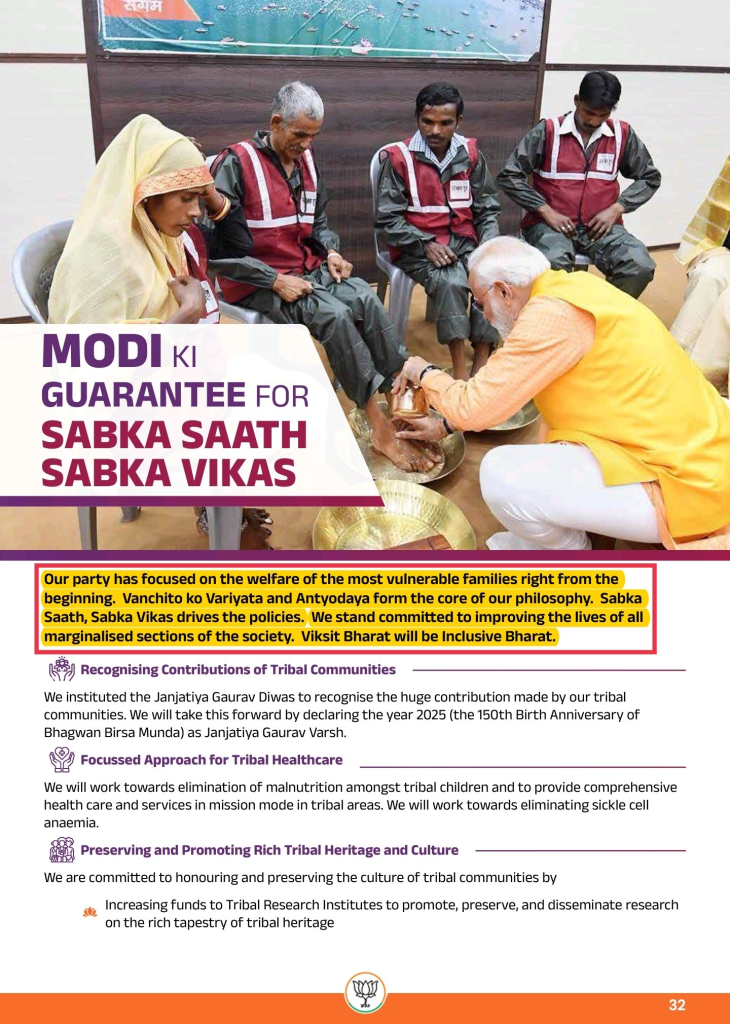 The Bharatiya Janata Party’s election manifesto, Sankalp Patra, guarantees improvements in the lives of all marginalized sections of society. It also promises that a Viksit Bharat (Developed India) will be an Inclusive Bharat (Inclusive India). However, it does not commit to a legislative pathway for the annihilation of caste. The manifesto makes no mention of caste or caste-based discrimination. It also omits references to the Scheduled Castes and the Scheduled Tribes (Prevention of Atrocities) Act, 1989, and does not address the issue of proportional representation.