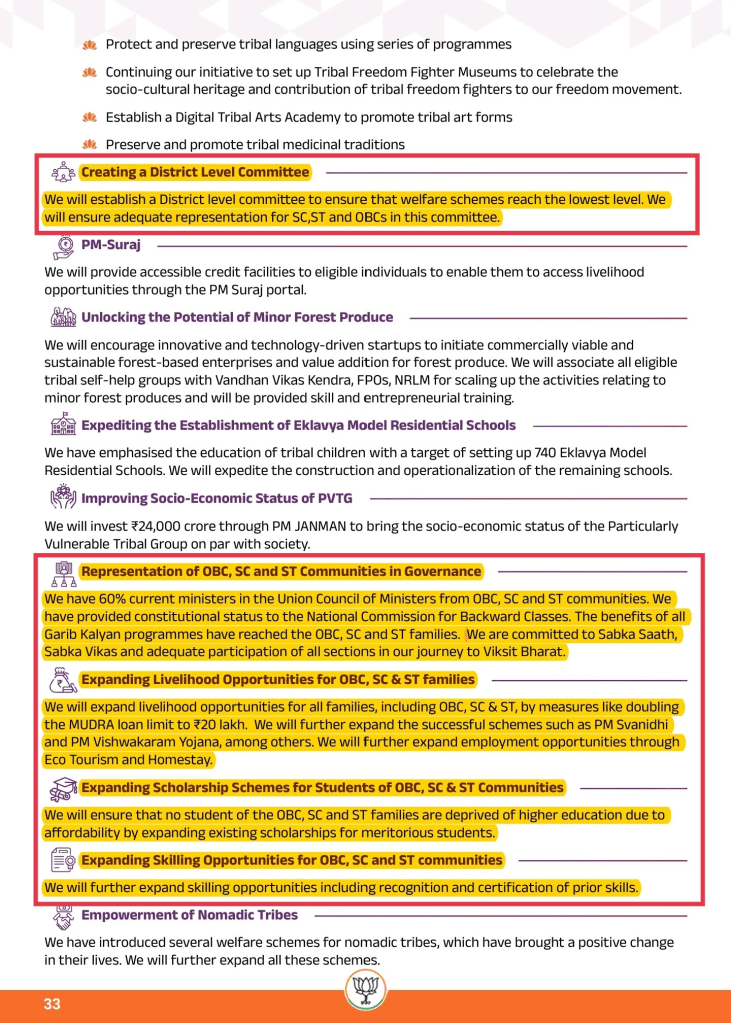 SankalpPatra mentions that 60% ministers in the Union Council belong to the Scheduled Castes, Scheduled Tribes, and Other Backward Classes. It promises to ensure adequate participation of all sections. However, it is important for the BJP to understand that the Scheduled Castes do not need “adequate” but “proportionate” representation, and the only way to ensure that is conducting a nationwide Caste Census.